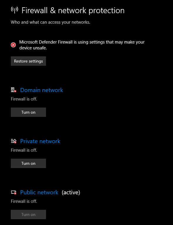 Navigate to Firewall & Network Protection Settings (Windows Search > Firewall & Network Protection > Turn All Three Off)