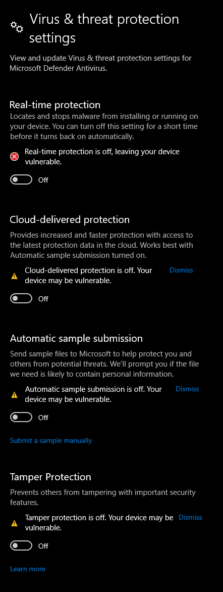 Navigate to Virus & Threat protection (Windows Search > Virus & Threat Protection > Manage Settings )