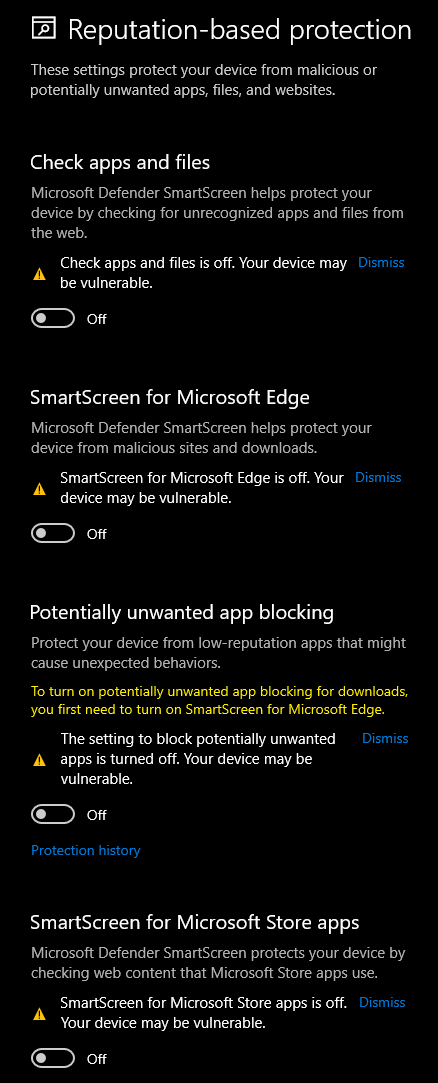 Navigate to App & Browser Control (Windows Search > App & Browser Control > Reputation-Based Protection Settings > Turn off all four )